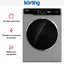 Стиральная машинка Кортинг KWD 58L1496 оснащена барабаном из нержавеющей стали PearlDrum со сферическими выпуклостями, который справляется со всеми загрязнениями и не повреждает вещи. На черной электронной панели управления находятся диск выбора программ, цифровой дисплей, кнопки регулировки температуры воды и скорости вращения при отжиме, кнопка отсрочки запуска, кнопки выбора продолжительности и варианта сушки — например, «Сушка в корзине», «В развешенном состоянии» или «Глажение». Длительность сушки может составить от 30 до 120 минут. Максимальное время отсрочки старта составляет 24 часа. Наибольшая скорость отжима достигает 1400 об/мин. Для стирки можно применять жидкие моющие средства, заливая их в специальный диспенсер.