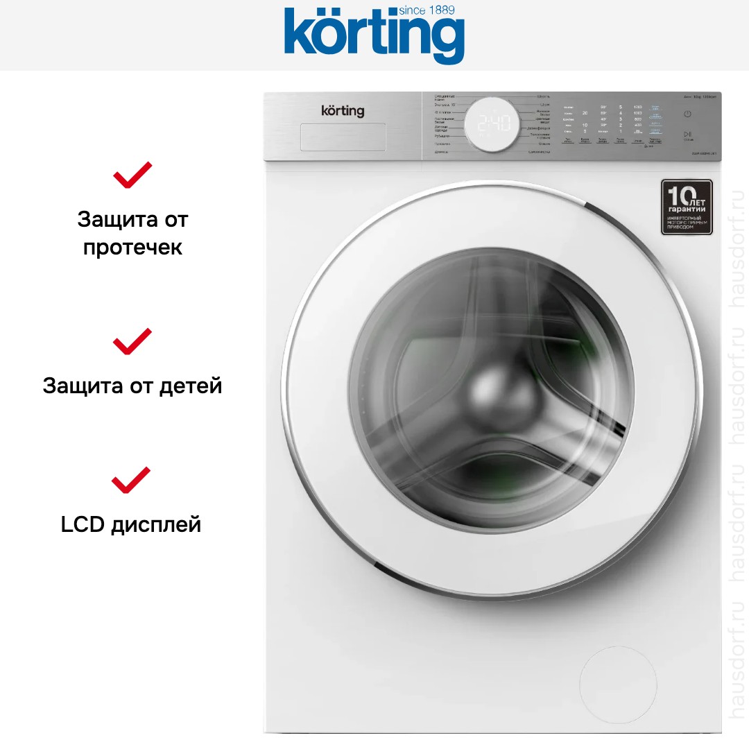 Стиральная машина Korting KWM 60DM1201 — мощный и практичный прибор для дома с фронтальной загрузкой и вместимостью до 10 кг белья. Модель выполнена в универсальном белом цвете, снабжена белым люком и впишется в любой интерьер благодаря строгим формам и нейтральной цветовой гамме. Габариты 85×59.5×62 см делают устройство подходящим для стандартных ниш и кухонных зон. При открытой дверце глубина составляет 113.9 см, угол открытия — 130°, что упрощает погрузку объемных вещей. Барабан из нержавеющей стали гарантирует бережное отношение к ткани и долговечность.