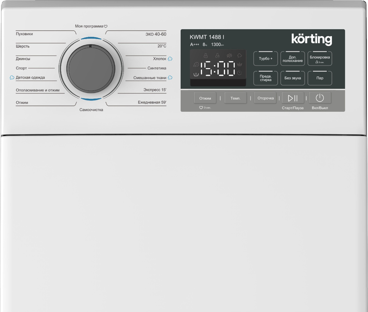 Электронное управление удобно и понятно. Для выбора программ используются кнопки, поворотный программатор. Количество режимов для стирки разных типов белья: 16.