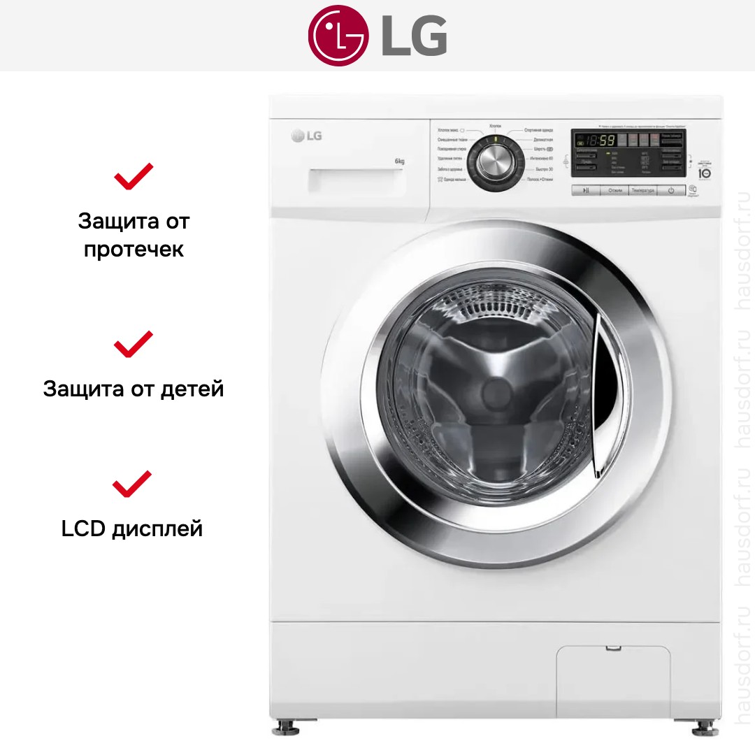 Стиральная машина LG F1096TD3 — белая отдельно стоящая модель с фронтальной загрузкой и эффектным люком из нержавеющей стали, который выглядит стильно в любом интерьере. Как покупатель бытовой техники, я ценю продуманную внешность: лаконичные линии, компактные габариты 85×60×55 см и нейтральный цвет позволяют легко вписать аппарат в нишу ванной или в кухонный гарнитур.