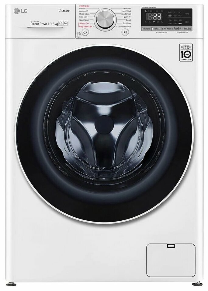Стиральная машина Лджи F4V5RYPOW выпущена в стандартной конфигурации — устанавливается отдельно, поэтому рекомендуем заранее выделить для нее место в квартире. Благодаря классической фронтальной загрузке она привычна и удобна даже для тех, кто не очень разбирается в технике. В барабан помещается большое количество белья, что подойдет большим семьям или тем, кто часто стирает объемные вещи — постельное белье, верхнюю одежду. Максимальная загрузка: 10.5 кг.