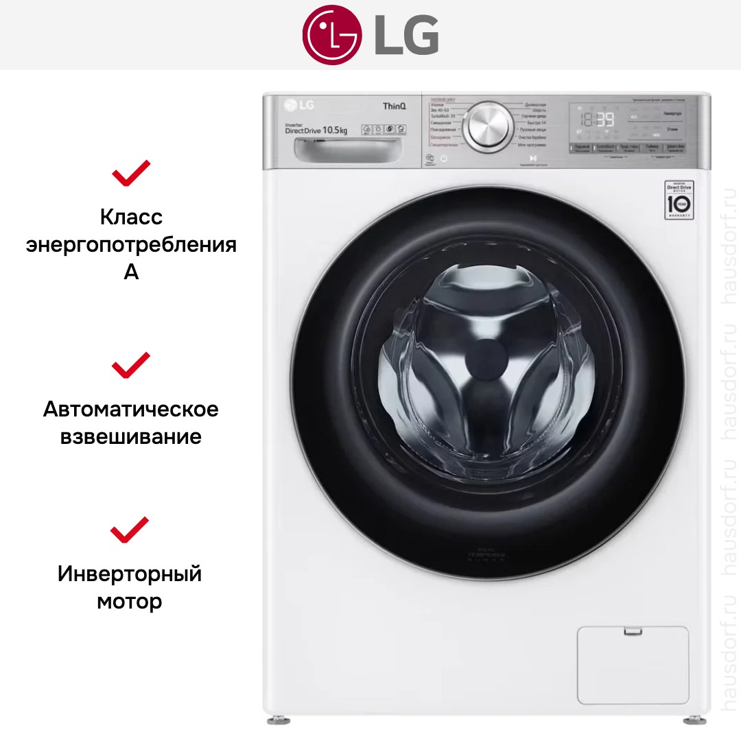 Стиральная машина Лджи TW4V9RW9E выпущена в стандартной конфигурации — устанавливается отдельно, поэтому рекомендуем заранее выделить для нее место в квартире. Благодаря классической фронтальной загрузке она привычна и удобна даже для тех, кто не очень разбирается в технике. В барабан помещается большое количество белья, что подойдет большим семьям или тем, кто часто стирает объемные вещи — постельное белье, верхнюю одежду. Максимальная загрузка: 10.5 кг.