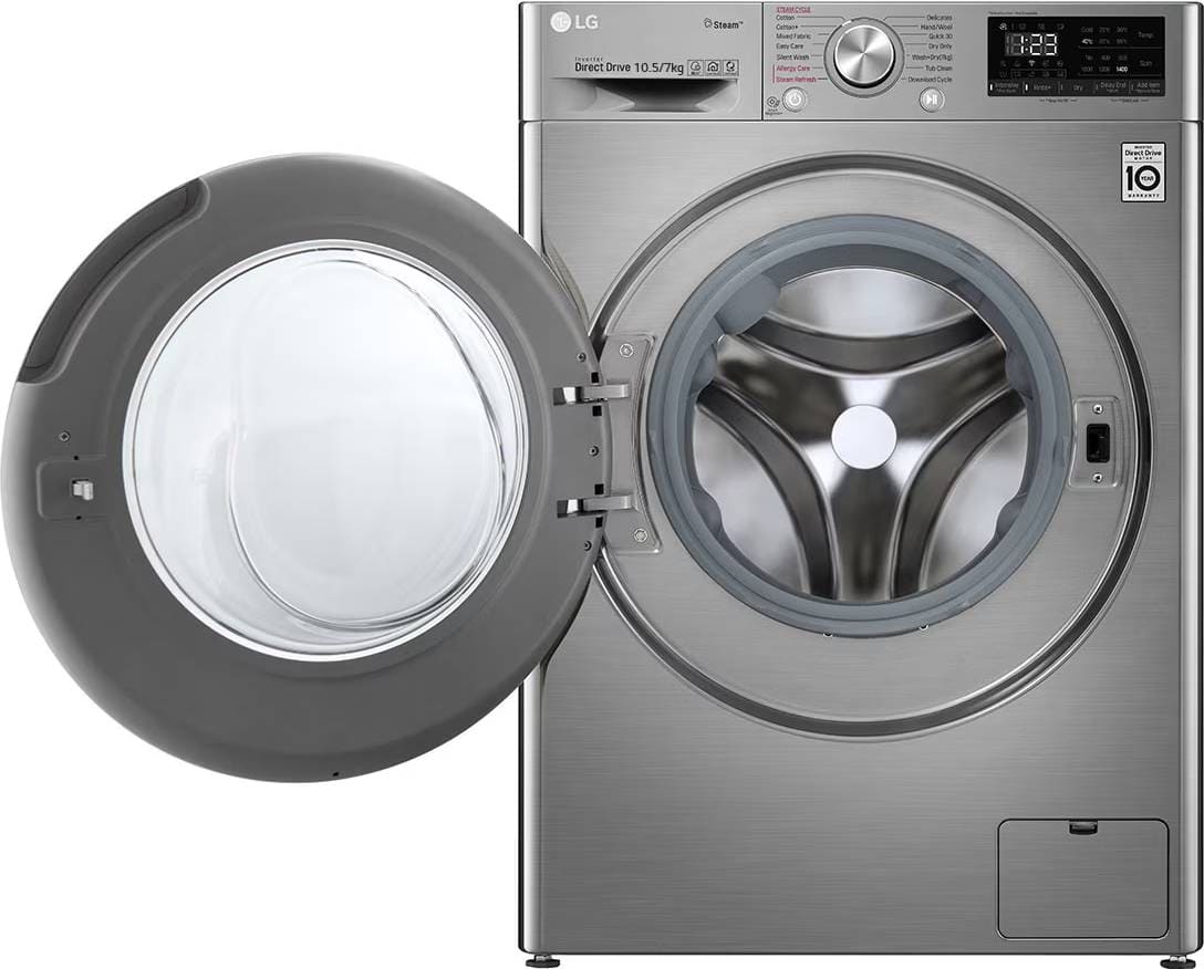 Стиральная машина Лджи F4V5RGP2T выпущена в стандартной конфигурации — устанавливается отдельно, поэтому рекомендуем заранее выделить для нее место в квартире. Благодаря классической фронтальной загрузке она привычна и удобна даже для тех, кто не очень разбирается в технике. В барабан помещается большое количество белья, что подойдет большим семьям или тем, кто часто стирает объемные вещи — постельное белье, верхнюю одежду. Максимальная загрузка: 10.5 кг.