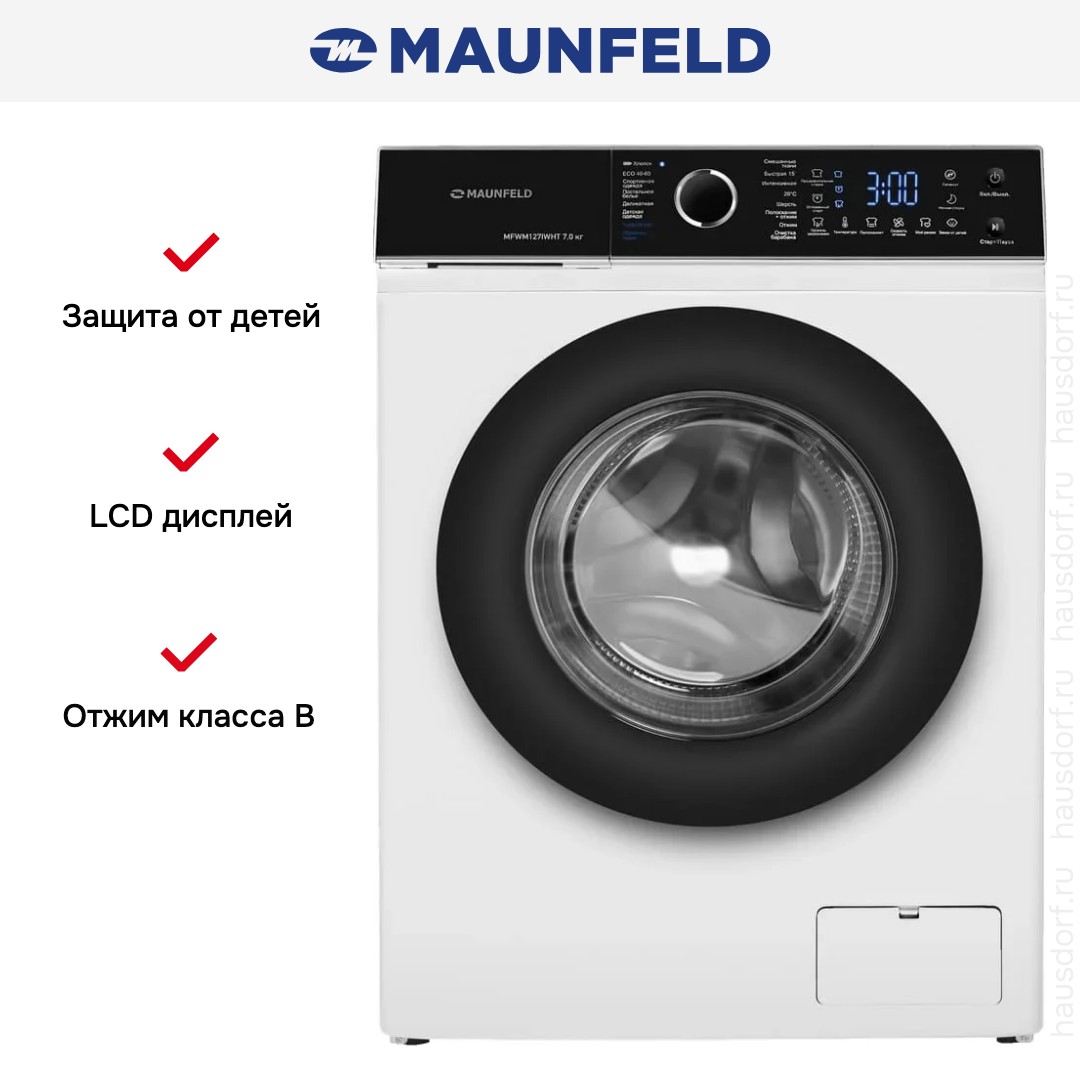 Стиральная машина Maunfeld MFWM127IWHT представляет собой продуманное сочетание лаконичного внешнего вида и практичных возможностей, созданное для уверенного решения бытовых задач. Ее чистая белая панель гармонично контрастирует с черным люком, формируя современный образ, который легко впишется в интерьер любой ванной или прачечной. Корпус стандартных габаритов 85×59.5×44 см обеспечивает вместимость до 7 кг, при этом компактная глубина экономит полезное пространство, а ножки с регулировкой позволяют быстро выровнять прибор на неровном полу. Фронтальная загрузка с углом открытия дверцы 135° делает укладку и извлечение белья удобным, а защитная блокировка люка и блокировка панели управления гарантируют безопасность при эксплуатации, особенно в семьях с детьми. Продуманная панель управления с наклоном и цифровым дисплеем объединяет поворотный программатор и сенсорные кнопки, обеспечивая интуитивный выбор одной из 16 доступных программ: от стандартных хлопка и смешанного белья до деликатных опций — ручной стирки, шерсти и полностью без отжима. Для экономии времени предусмотрены экспресс-циклы, включая супербыструю стирку 15 минут и режим экономичной очистки, а для особо загрязненных изделий доступна предварительная стирка и интенсивные программы с повышенной энергией обработки. Специальные алгоритмы позволяют заботиться о белье разных типов — постельном, спортивном или детском — и обеспечивают деликатное обращение с тканями, а отдельная функция «полоскание» и опция дополнительного полоскания усиливают эффект удаления моющих средств. Модель поддерживает выбор температуры и скорости отжима до 1200 об/мин с возможностью полного отключения центрифуги, а инверторный мотор обеспечивает плавные обороты, экономное потребление и повышенную надежность; класс энергопотребления A+++ и годовой расход энергии 174 кВт·ч свидетельствуют о выгодной эксплуатации, а средний расход воды 41 литр за цикл и годовой показатель 11500 л помогают планировать ресурсы. Для удобства предусмотрены отсрочка старта, память для сохранения индивидуальных настроек и режим TurboWash20°C для эффективной работы при низких температурах; цифровая индикация отображает ход программы, температуру, скорость отжима, остаточное время, выбранные опции, уровень загрязнения и состояние блокировок. Техника оснащена тремя отделениями для моющих средств, функцией контроля дисбаланса и системой самодиагностики, облегчающей обнаружение неполадок; при отжиме уровень шума достигает 76 дБ, при основной стирке — около 60 дБ, что обеспечивает приемлемый комфорт в жилой зоне. Компактный вес 53 кг и транспортные размеры 88×67×58 см упрощают доставку и установку, а параметры электросети 220-240 В, 50 Гц и номинальная мощность 1.7 кВт соответствуют стандартным требованиям домашней проводки с предохранителем 10 А. Эта модель станет надежным помощником в повседневной уборке гардероба, сочетая функциональность, экономичность и удобство эксплуатации без лишней сложности.