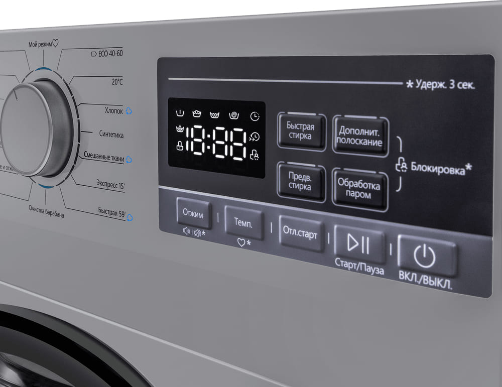 Блокировка панели управления позволяет предотвратить нажатие таких кнопок, как пуск и пауза, регулировка температуры и скорости отжима, кнопок дополнительных функций, а также не допустить поворота переключателя. В некоторых машинах невозможно заблокировать кнопку включения и выключения, однако снять блокировку с ее помощью невозможно.