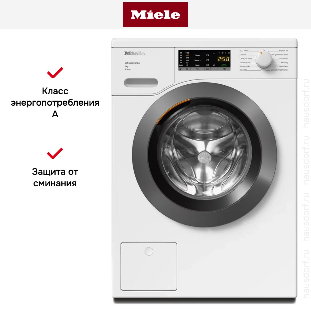 В машинах Miele защита от сминания работает, если белье невозможно извлечь сразу после отжима, периодически вращая барабан и встряхивая его содержимое.