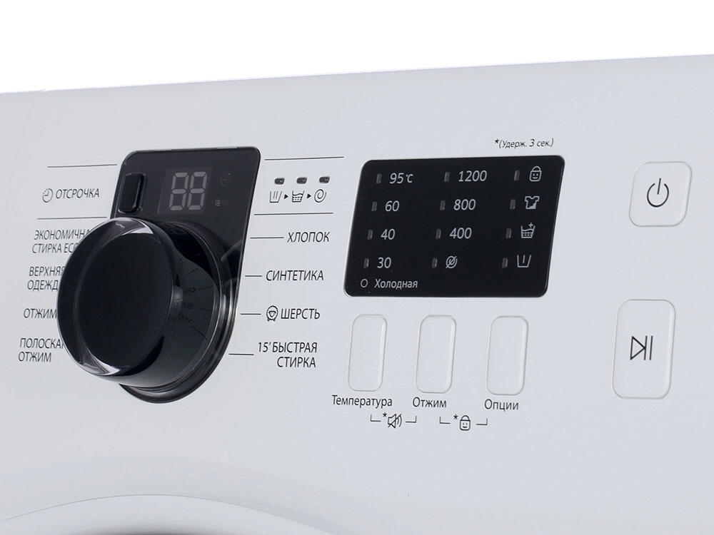 Вы можете отложить запуск, если хотите сэкономить на тарифах и включить машинку ночью, либо если планируете развесить белье сразу после возвращения работы и не ждать, пока закончится цикл. На панели управления отображаются разнообразные индикаторы, чтобы было проще следить за процессом, например: хода программы, включения и выключения. Скорость отжима достигает 1200 оборотов в минуту. Функцию отжима можно будет отключить вручную, если она вам не нужна.