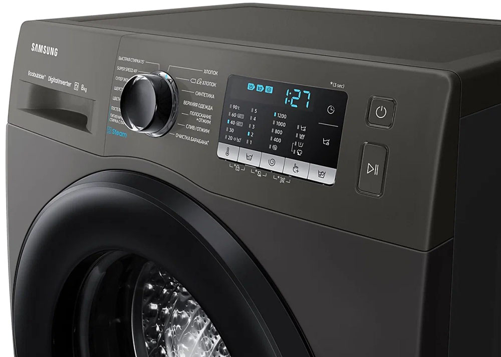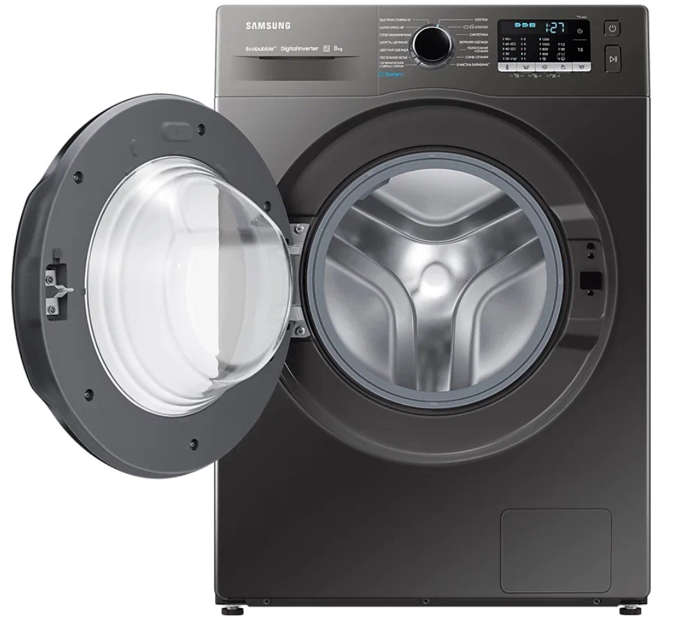 Цвет этой стиральной машинки — серый. В данной модели Samsung используется барабан Swirl. Мотор: Инверторный. Благодаря ему машина работает тише, потребляет меньше электроэнергии, сохраняя при этом необходимую мощность.