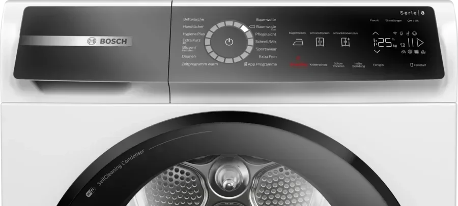 Самоочистка конденсатора — полезная функция, присутствующая в сушильных машинах от ведущих производителей бытовой техники, например, Bosch и Siemens, и облегчающая уход за прибором. Конденсатором оснащаются устройства с конденсационной сушкой или сушкой с тепловым насосом . Для очистки требуется только выбрать соответствующую программу и запустить ее: ворсинки и прочий мусор будут удалены автоматически. В некоторых случаях очистка производится без участия человека после каждого рабочего цикла: чтобы промыть конденсатор, используется влага, полученная в процессе сушки.