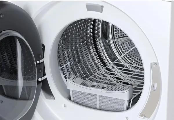 - Тепловой насос — поступающий внутрь воздух нагревается, что ускоряет и улучшает эффективность сушки. Затем он проходит через конденсационный отдел, отдает влагу и сухим повторно возвращается в барабан.