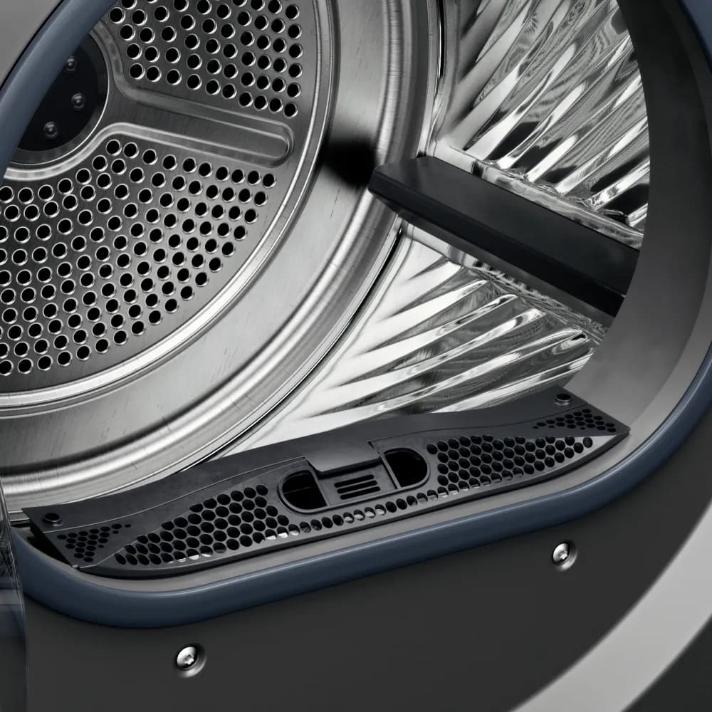 - Тепловой насос — поступающий внутрь воздух нагревается, что ускоряет и улучшает эффективность сушки. Затем он проходит через конденсационный отдел, отдает влагу и сухим повторно возвращается в барабан.