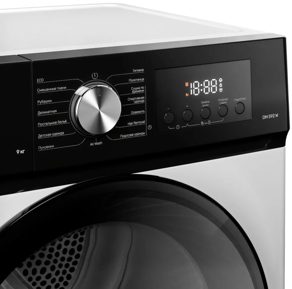 В барабан единовременно можно загрузить 9 кг. Подсветка — не только красивая, но и функциональная деталь, так как дает хороший обзор, как проходит сушка. Цвет корпуса — белый.