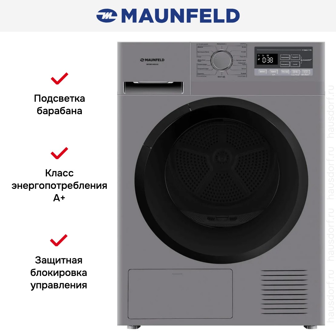 Сушильная машина Maunfeld MFDM168SL02 — стильный и продуманный в мелочах бытовой прибор, который сочетает современный внешний вид и практичный набор функций. Корпус в оттенке нержавеющей стали гармонирует с панелью управления, выполненной в комбинации металла и черного цвета, круглая дверца с затемненным стеклом добавляет ансамблю выразительности, при этом петля расположена справа, а угол открывания достигает 160°, что удобно при загрузке и выгрузке белья; для устойчивости предусмотрены регулируемые ножки. Барабан из качественной нержавеющей стали оснащен внутренней подсветкой, что облегчает контроль содержимого, а габариты 84,5×59,5×61 см делают агрегат подходящим для типовой домашней прачечной, при этом глубина с открытой дверцей составляет 105 см. Технологически аппарат использует экономичную тепловую насосную систему с хладагентом R290, что обеспечивает класс энергопотребления A+ и среднегодовой расход 291 кВт·ч, а класс сушки B гарантирует эффективную обработку разных тканей при разумном потреблении электроэнергии; максимальная загрузка равна 8 кг. В арсенале — 16 программ, среди которых стандартные режимы для хлопка и синтетики, деликатные режимы для шерсти и тонких вещей, экспресс‑сушка для оперативного восстановления гардероба, а также специальные методы ухода: теплый или холодный обдув и функция антисминания для уменьшения складок. Для разнообразных типов одежды предусмотрены отдельные циклы для спортивного белья, смешанных загрузок и джинсов, есть режимы для постельного комплекта и возможность установки сушки по времени. Инновационные опции включают обработку паром для освежения, настройки по остаточной влажности — «под утюг», «экстрасушка» и «в шкаф», что позволяет точно подобрать степень готовности изделий к дальнейшему использованию. Электронное управление реализовано через поворотный программатор и кнопки, дополненные цифровым дисплеем с индикацией оставшегося времени, длительности отсрочки запуска, необходимости опорожнения конденсатора и очистки ворсового фильтра, активных блокировок и ошибок; присутствует отсрочка старта от 1 до 24 часов, звуковой сигнал по окончании, сохранение пользовательских настроек, контроль влажности и блокировка для детей. В комплект входят ворсовый фильтр, емкость для сбора конденсата и дренажный шланг с соединителем и держателем, что дает варианты отвода влаги; тип двигателя стандартный, уровень шума составляет 66 дБ, собственный вес 42 кг, брутто 45,66 кг, в упаковке размеры 89×66×68 см. Подключение рассчитано на 220-240 В, 50 Гц, номинальный предохранитель 3,5 А, потребляемая мощность до 0,8 кВт; встроена сервисная диагностика для быстрого определения неисправностей. Этот аппарат сочетает аккуратный дизайн и широкий функционал, позволяя гибко управлять процессом сушки и экономить ресурсы в условиях домашнего использования, а бренд Maunfeld гарантирует внимательное отношение к деталям и соответствие заявленным характеристикам. Артикул: КА-00026521.