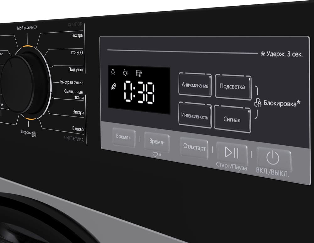 Элементы на панели управления сушильной машины служат для выбора программы сушки, для регулировки параметров работы, для задания дополнительных опций. Большинство сушильных маши оборудовано поворотными переключателями: с их помощью можно легко выбирать программу сушки — по остаточной влажности, по типу ткани, по виду изделий, по времени. Кнопки предназначаются для добавления к программе дополнительных опций: они могут быть как обычными, так сенсорными — в последнем случае все варианты выбора отображаются на дисплее, и возможности управления становятся более удобными и гибкими.