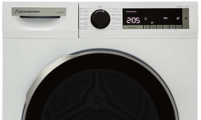 Панель управления в современных сушильных машинах находится в верхней части корпуса. Элементы управления — дисплей, поворотный переключатель, кнопки, индикаторы, — располагаются таким образом, чтобы пользователь мог легко ориентироваться в выборе параметров работы. В большинстве моделей панель управления располагается строго вертикально. Это не слишком удобно для пользователей высокого роста или для тех, кто имеет проблемы со зрением: им приходится наклоняться, например, чтобы выбрать ту или иную программу. В связи с этим некоторые производители начали переносить панель управления на крышку машины: так, фирма Schulthess предлагает две модификации одной и той же модели — с вертикальной и горизонтальной панелью управления.