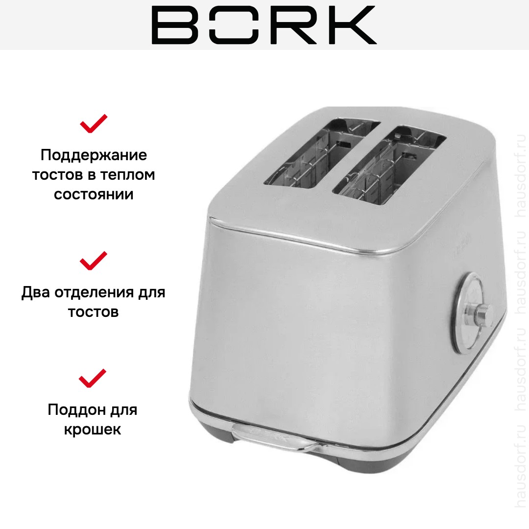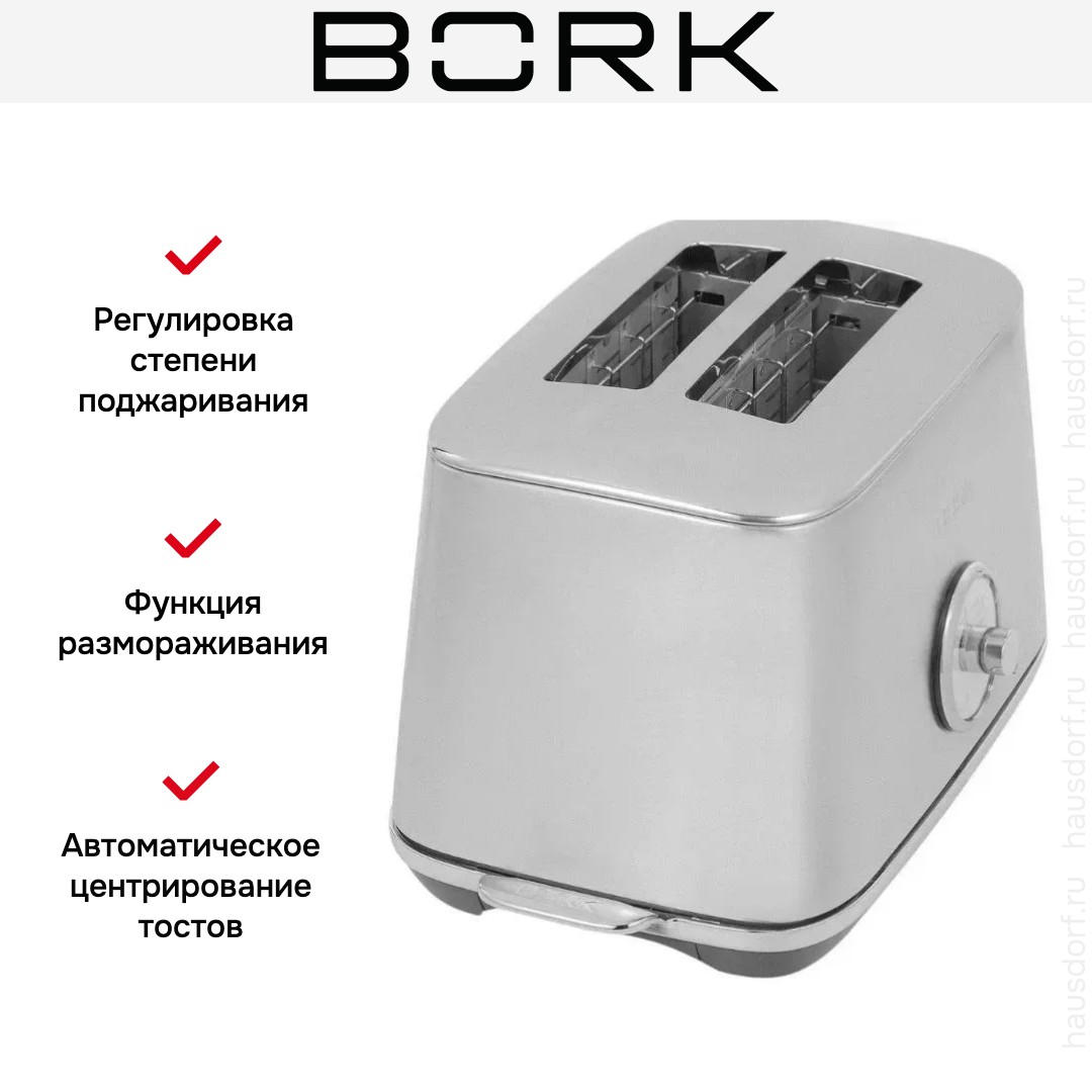 Тостер BORK T703-GG представляет собой стационарный кухонный прибор с лаконичным серебристым корпусом из нержавеющей стали, который органично впишется в современный интерьер. Его компактные габариты 20×33×20 см и небольшой вес 2,4 кг обеспечивают удобство размещения даже на ограниченной рабочей поверхности. Материал корпуса гарантирует долговечность и устойчивость к коррозии, а полированная сталь придает изделиям эстетический блеск и простоту в уходе.