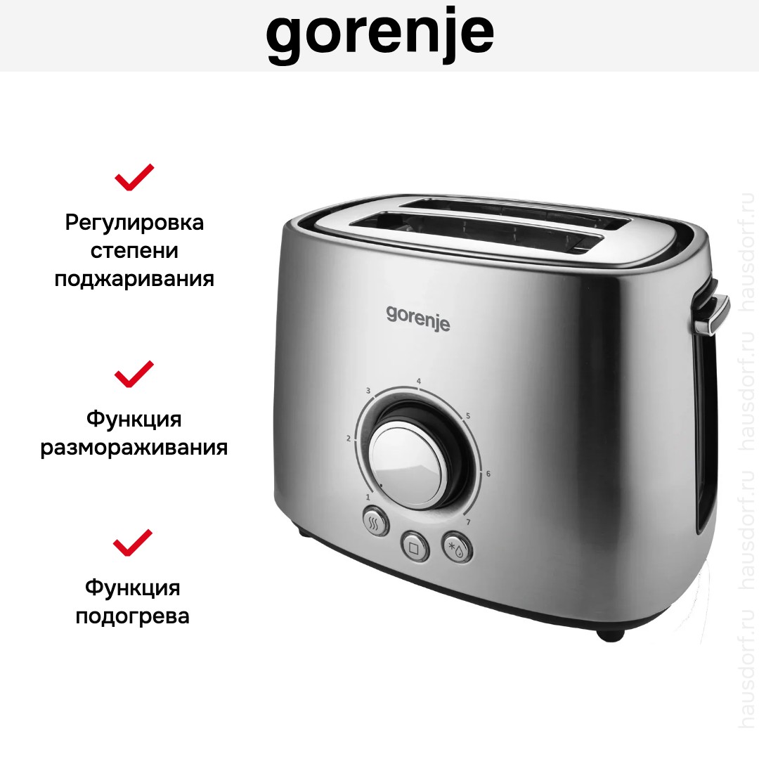 Стильный тостер Gorenje имеет компактный корпус на устойчивых ножках, благодаря которым не пошатывается, даже если хлеб выпрыгивает вверх в конце приготовления. Основной материал, из которого изготовлен прибор, — пластик/ сталь. Его главный оттенок — нержавеющая сталь. Простое и понятное механическое управление позволяет быстро разобраться во всех функциях. Простое и понятное электронное управление позволяет быстро разобраться во всех функциях. На корпусе расположены кнопочные+поворотные переключатели для изменения настроек.