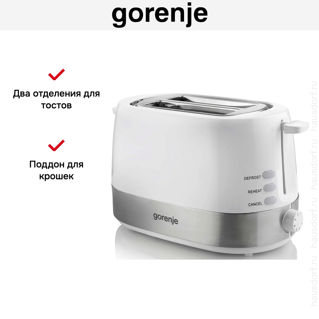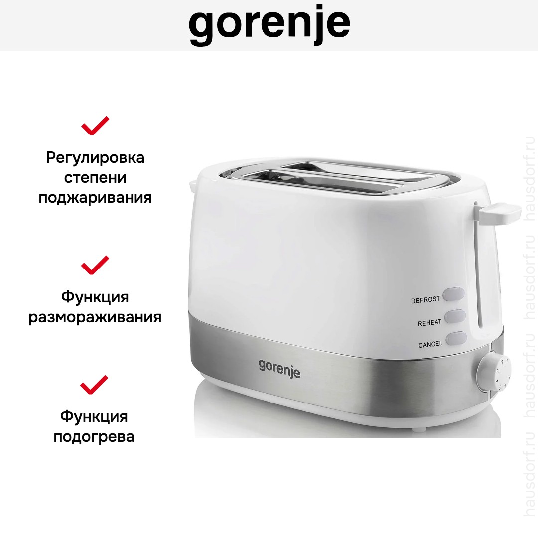 Стильный тостер Gorenje имеет компактный корпус на устойчивых ножках, благодаря которым не пошатывается, даже если хлеб выпрыгивает вверх в конце приготовления. Основной материал, из которого изготовлен прибор, — пластик/ сталь. Его главный оттенок — белый. Простое и понятное механическое управление позволяет быстро разобраться во всех функциях. Простое и понятное электронное управление позволяет быстро разобраться во всех функциях. На корпусе расположены кнопочные+поворотные переключатели для изменения настроек.