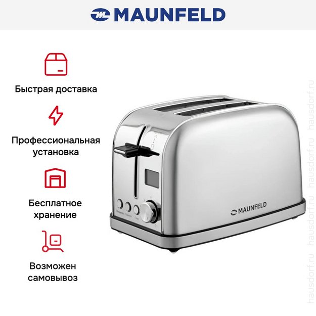 Стильный тостер Maunfeld имеет компактный корпус на устойчивых ножках, благодаря которым не пошатывается, даже если хлеб выпрыгивает вверх в конце приготовления. Основной материал, из которого изготовлен прибор, — нержавеющая сталь. Его главный оттенок — нержавеющая сталь. Простое и понятное механическое управление позволяет быстро разобраться во всех функциях. Простое и понятное электронное управление позволяет быстро разобраться во всех функциях. На корпусе расположены кнопочные+поворотные переключатели для изменения настроек. Благодаря небольшому дисплею еще удобнее следить за процессом.