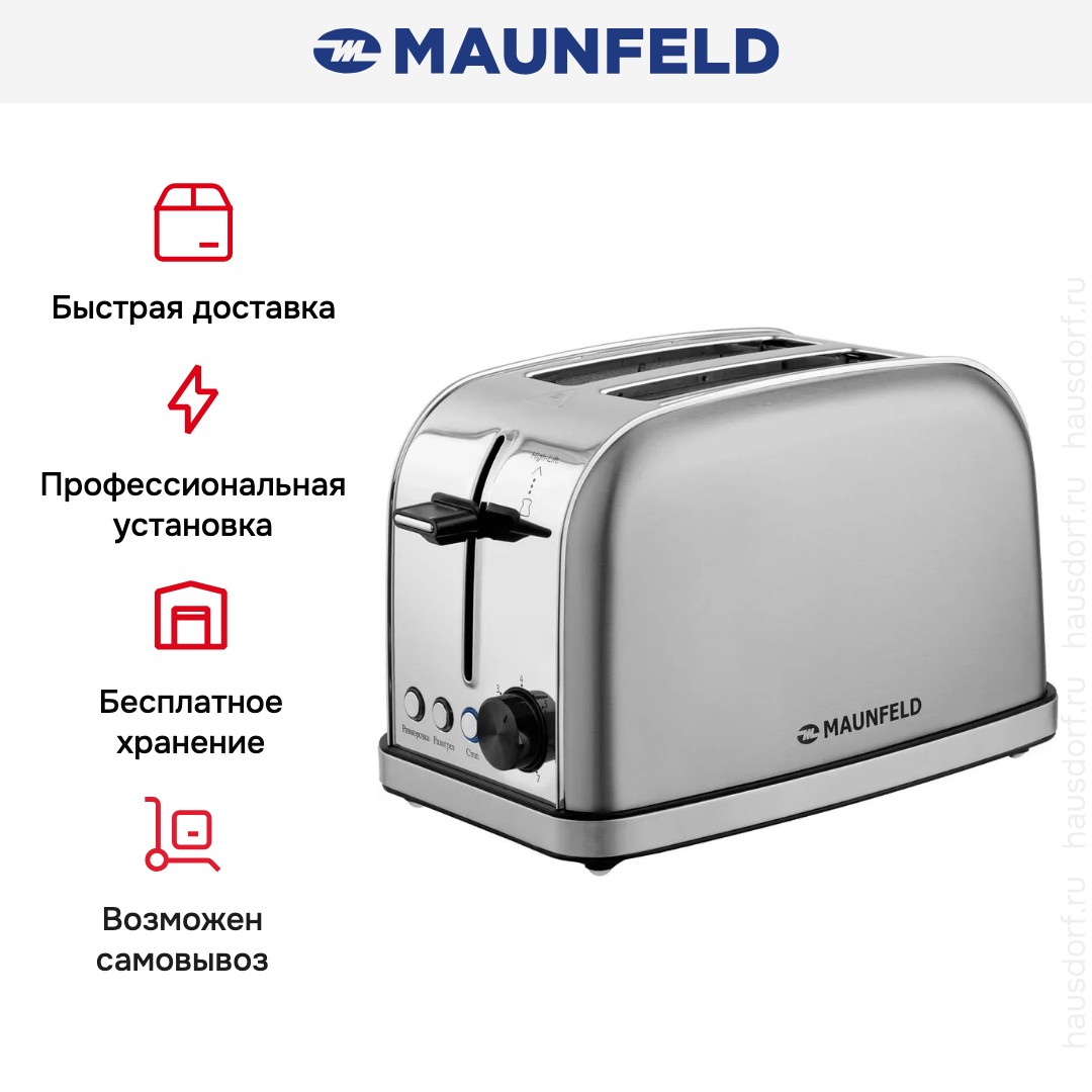 Стильный тостер Maunfeld имеет компактный корпус на устойчивых ножках, благодаря которым не пошатывается, даже если хлеб выпрыгивает вверх в конце приготовления. Основной материал, из которого изготовлен прибор, — нержавеющая сталь. Его главный оттенок — нержавеющая сталь. Простое и понятное механическое управление позволяет быстро разобраться во всех функциях. Простое и понятное электронное управление позволяет быстро разобраться во всех функциях. На корпусе расположены кнопочные+поворотные переключатели для изменения настроек.