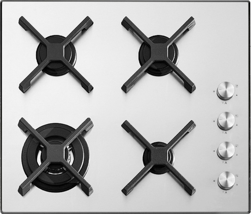Выбор газовой варочной панели чаще всего обусловлен тем, что в частный дом или квартиру проведен именно газ в качестве обогрева. Работать с этой моделью довольно просто, так как мощность нагрева видна невооруженным взглядом — по силе огня в горелке. Количество конфорок в этой модели: 4. Горелки с тройной короной имеют несколько ступеней нагрева — в зависимости от них образуется несколько кругов пламени.