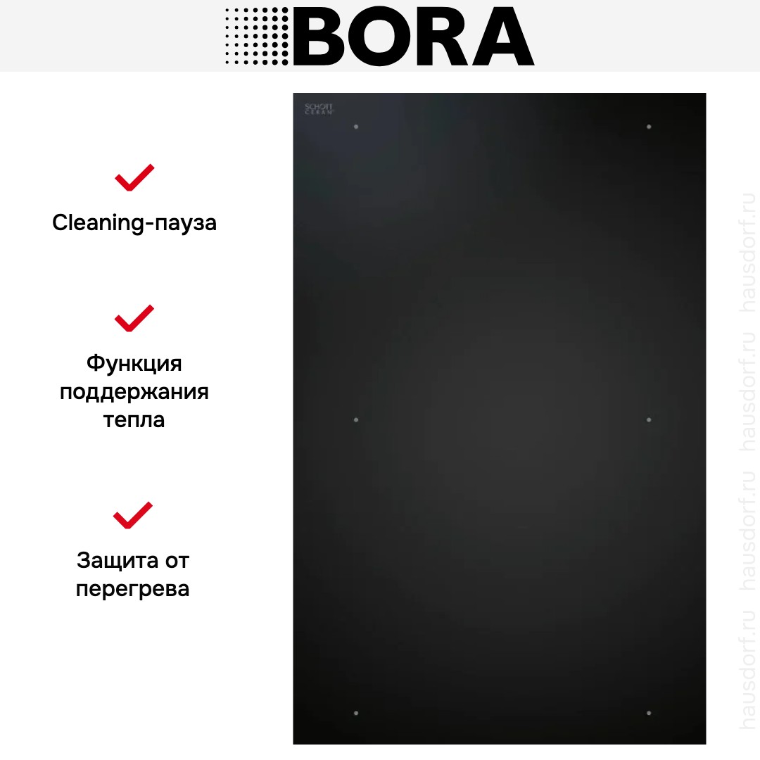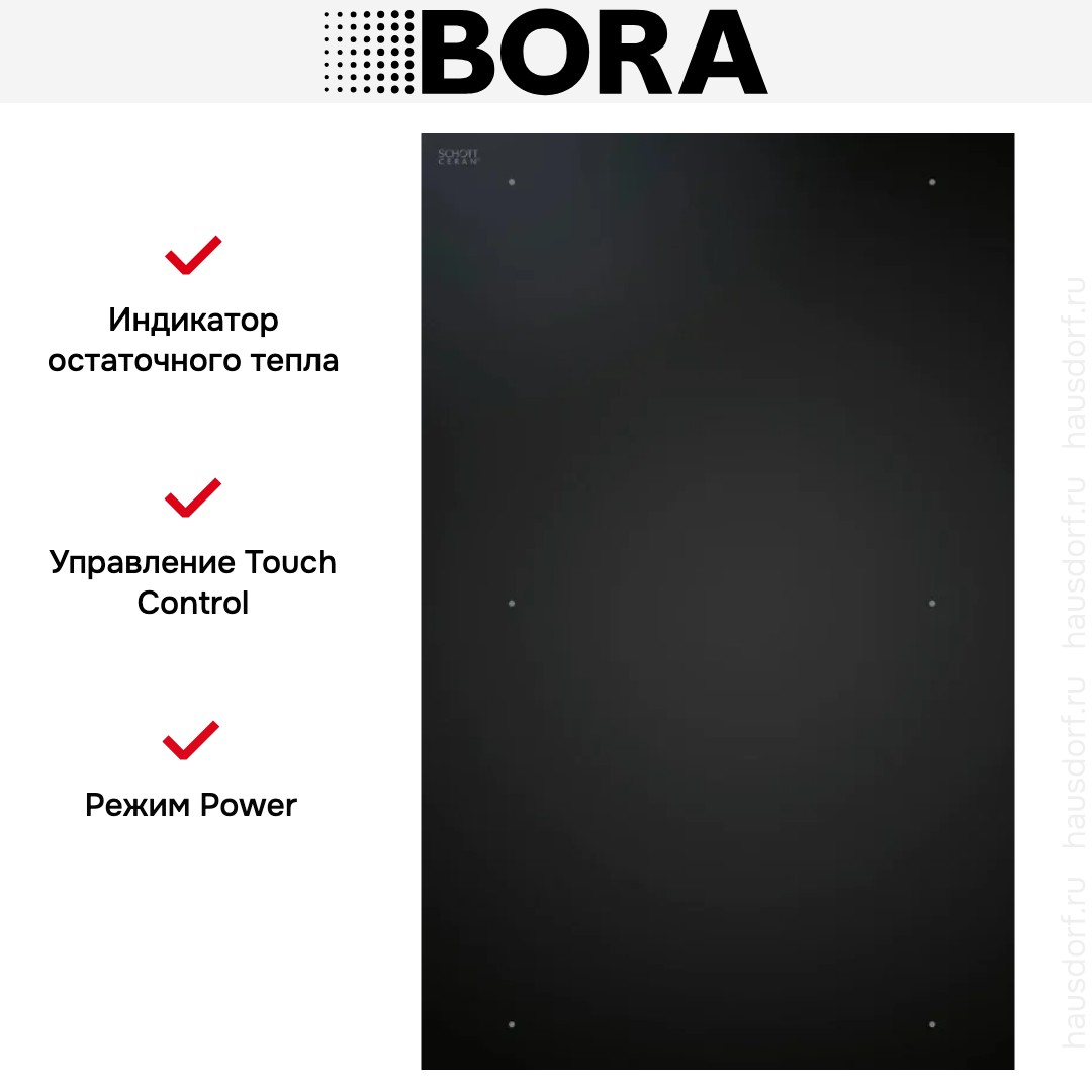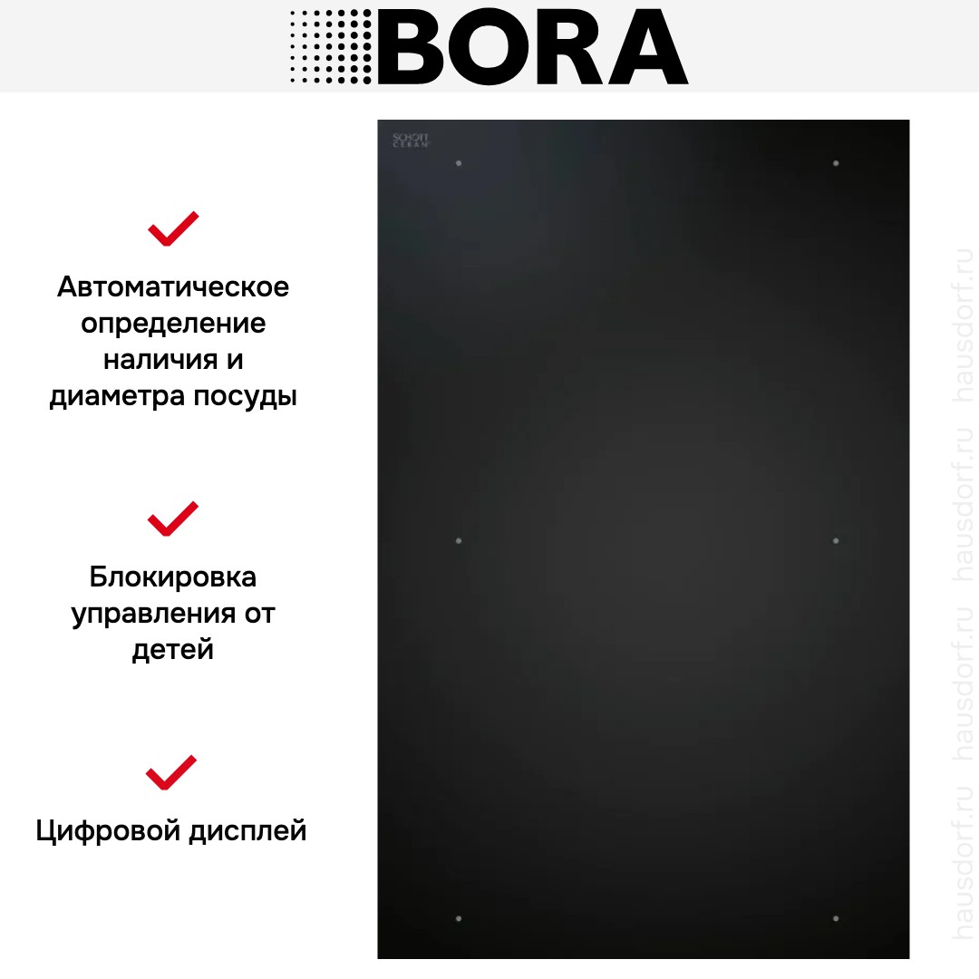Варочная панель BORA CKFI сочетает компактность и профессиональные функции для современной кухни. Эта модель выполнена в строгом классическом стиле, что делает её универсальным решением для любых интерьеров. Обработка края без рамки создаёт эффект «парящей» поверхности. Плоское стеклокерамическое покрытие легко очищается от брызг и пригоревшей пищи, а гладкая поверхность помогает поддерживать гигиену без дополнительных усилий.