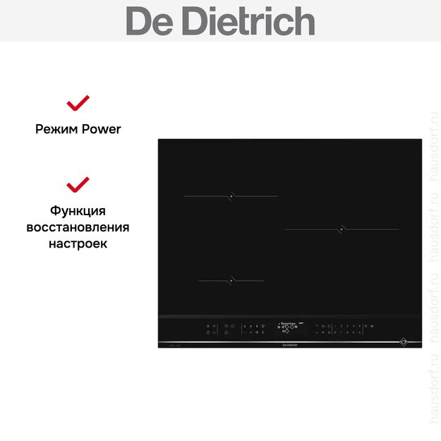 Индукционная варочная панель De Dietrich DPI4320X — это надежный помощник на кухне, сочетающий в себе передовые технологии, элегантный дизайн и широкий функционал. Устройство отличается высокой мощностью, удобным управлением, наличием ряда интеллектуальных опций и высоким уровнем безопасности.