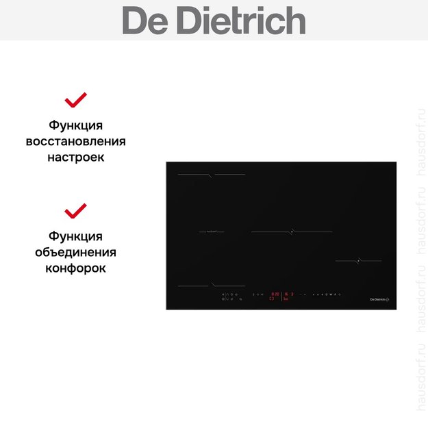 Модель Де Дитрих DPI4810B входит в дизайн-линейку: Philharmonie. Цвет — черный. Благодаря отсутствию рамки она отлично впишется в интерьер и не займет лишнее место на столешнице, которое можно использовать для работы. Материал самой поверхности: стеклокерамика. Управление этой моделью электронное. Для переключения уровней нагрева, выбора функций используются следующие переключатели: сенсорные/TouchControl. Продвинутая система контроля за прибором делают его современным и отвечающим на главные запросы покупателя.