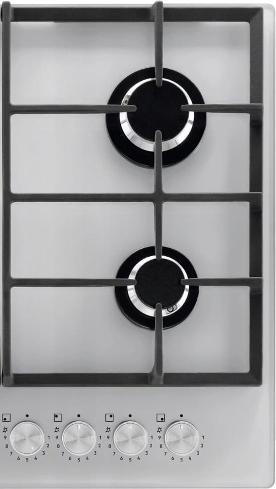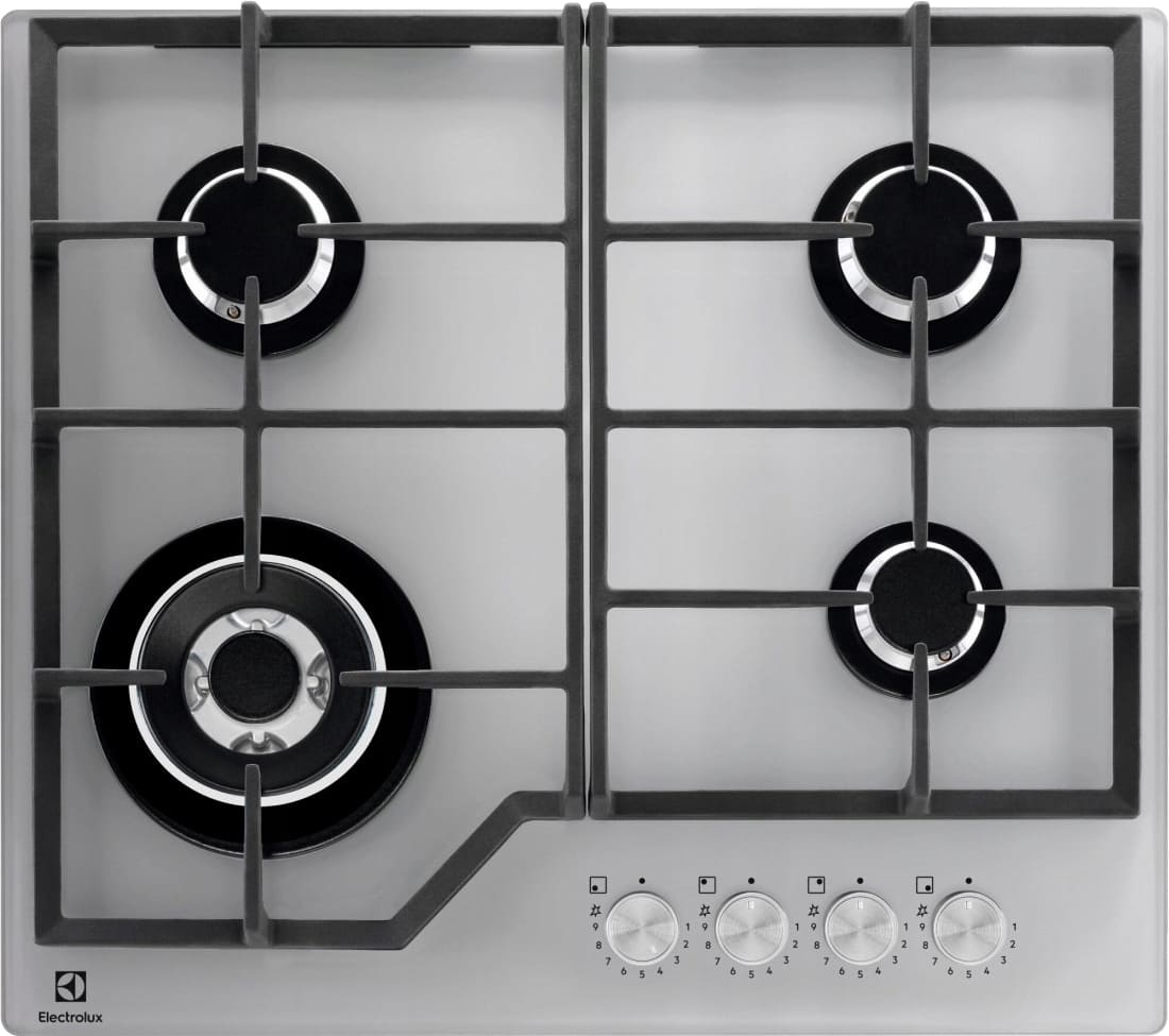 Выбор газовой варочной панели чаще всего обусловлен тем, что в частный дом или квартиру проведен именно газ в качестве обогрева. Работать с этой моделью довольно просто, так как мощность нагрева видна невооруженным взглядом — по силе огня в горелке. Количество конфорок в этой модели: 4. Горелки с двойной короной позволяют увеличивать мощность нагрева в зависимости от диаметра посуды.