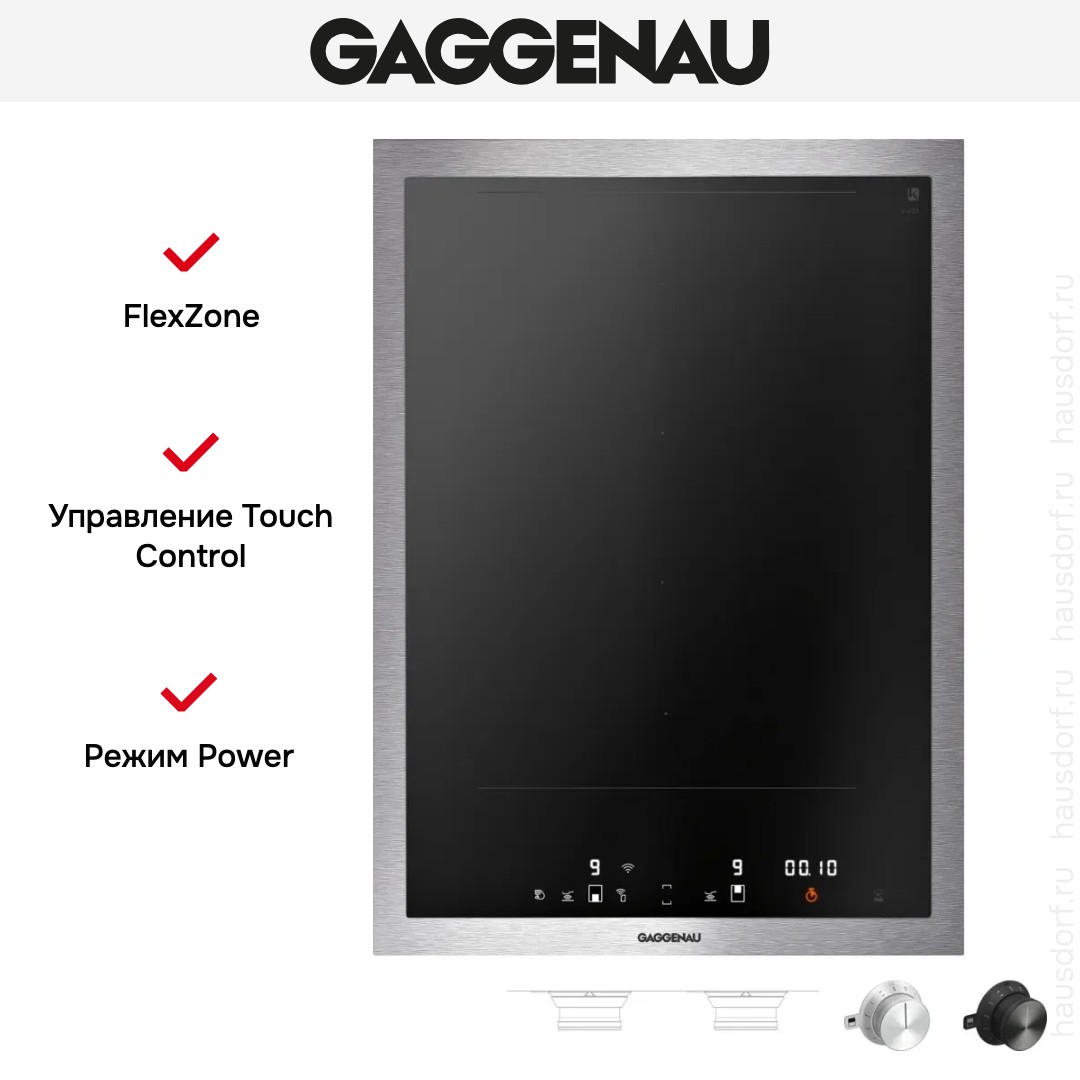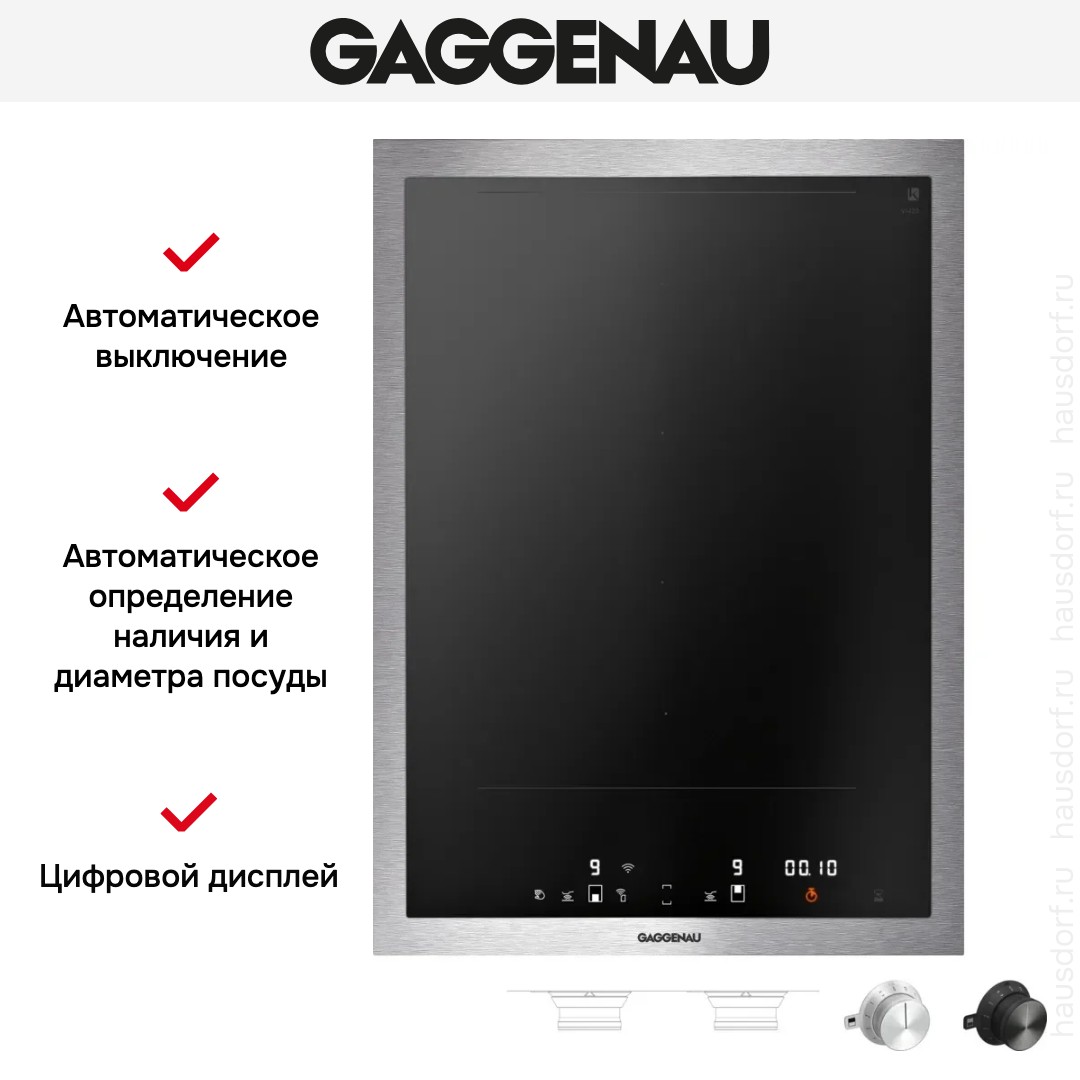 Модель Гаггенау VI422115 входит в дизайн-линейку: 400 series Vario. Цвет — черный. Благодаря рамке она отделена от рабочей зоны и прочнее закреплена на столешнице. Материал самой поверхности: стеклокерамика. Управление этой моделью электронное. Для переключения уровней нагрева, выбора функций используются следующие переключатели: сенсорные/TouchControl, поворотные переключатели с подсветкой. Продвинутая система контроля за прибором делают его современным и отвечающим на главные запросы покупателя.