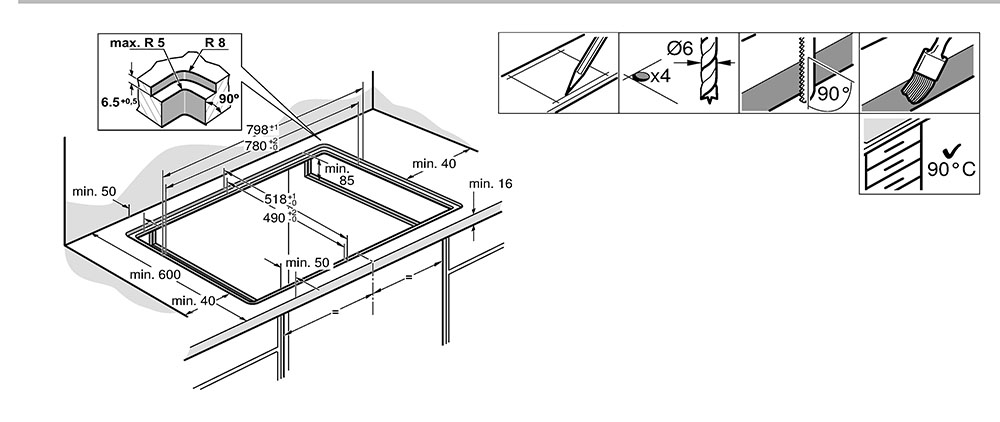 Отверстие в нише выполняют, исходя из размеров самой варочной панели — они должны соответствовать друг другу либо немного превышать размеры выреза. При выборе наиболее распространенной варочной панели с 4 конфорками в столешнице вырезается отверстие шириной 59 см и глубиной около 49-50 см. Толщина столешницы должна быть немного меньше, чем высота варочной панели, в противном случае панель придется заглубить, чтобы она не слишком выступала.