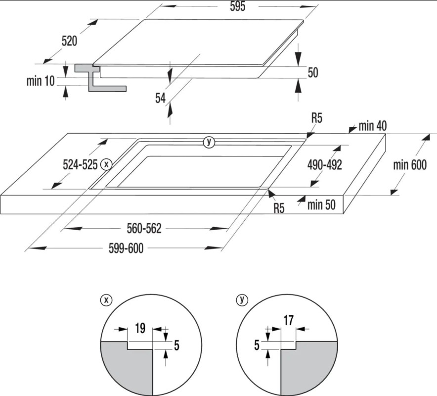 Отверстие в нише выполняют, исходя из размеров самой варочной панели — они должны соответствовать друг другу либо немного превышать размеры выреза. При выборе наиболее распространенной варочной панели с 4 конфорками в столешнице вырезается отверстие шириной 59 см и глубиной около 49-50 см. Толщина столешницы должна быть немного меньше, чем высота варочной панели, в противном случае панель придется заглубить, чтобы она не слишком выступала.