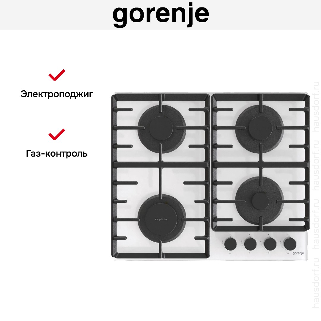 Варочная панель Gorenje GT642SYW — элегантная модель от именитого производителя. Поверхность из закаленного стекла белого цвета смотрится стильно и современно. Она легко очищается от загрязнений, отличается устойчивостью к появлению глубоких царапин и выцветанию. Светлый оттенок является практичным, так как на нем, в отличие от темных вариантов, менее заметны разводы или следы от рук. Дополняют образ черные регуляторы. Ручки располагаются справа, что позволяет увеличить рабочую зону слева. Регуляторы не только отличаются красивым лаконичным внешним видом, но и плавным, безрывковым ходом, который позволяет изменять мощность пламени даже на самые минимальные значения. В каждую ручку интегрировать электрический поджиг. Данная опция не только повышает комфорт эксплуатации, но и защищает от получения ожогов, что возможно при использовании спичек и зажигалок. Работает функция от электрической сети, поэтому требуется подключение прибора к розетке.