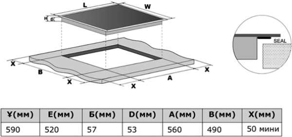 Стандартная ширина устройства составляет около 59–60 см: таковы наиболее востребованные четырехконфорочные модели. Подобный размер облегчает встраивание варочной панели в стандартную кухонную столешницу.