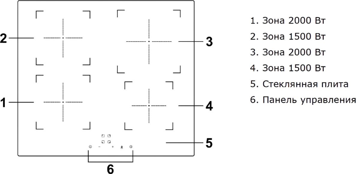 Элементы управления варочной панелью позволяют включать и выключать прибор, регулировать интенсивность нагрева, активировать дополнительные функции — временно увеличивать мощность, подключать контуры расширения конфорок, объединять зоны нагрева, задействовать защиту от детей, экстренно выключать все конфорки сразу и многое другое.