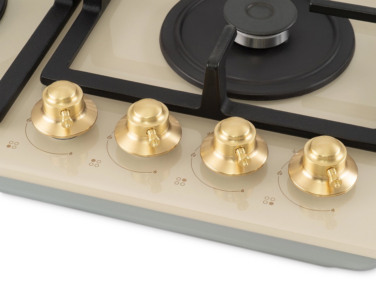Для варочных панелей в стиле кантри, ампир или классическом характерны латунные ручки из сплава меди и цинка, которые смотрятся благородно и выигрышно. Реже производятся модели, имеющие золотистую или медную фурнитуру.