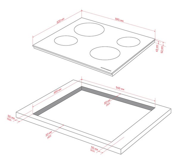 Отверстие в нише выполняют, исходя из размеров самой варочной панели — они должны соответствовать друг другу либо немного превышать размеры выреза. При выборе наиболее распространенной варочной панели с 4 конфорками в столешнице вырезается отверстие шириной 59 см и глубиной около 49-50 см. Толщина столешницы должна быть немного меньше, чем высота варочной панели, в противном случае панель придется заглубить, чтобы она не слишком выступала.