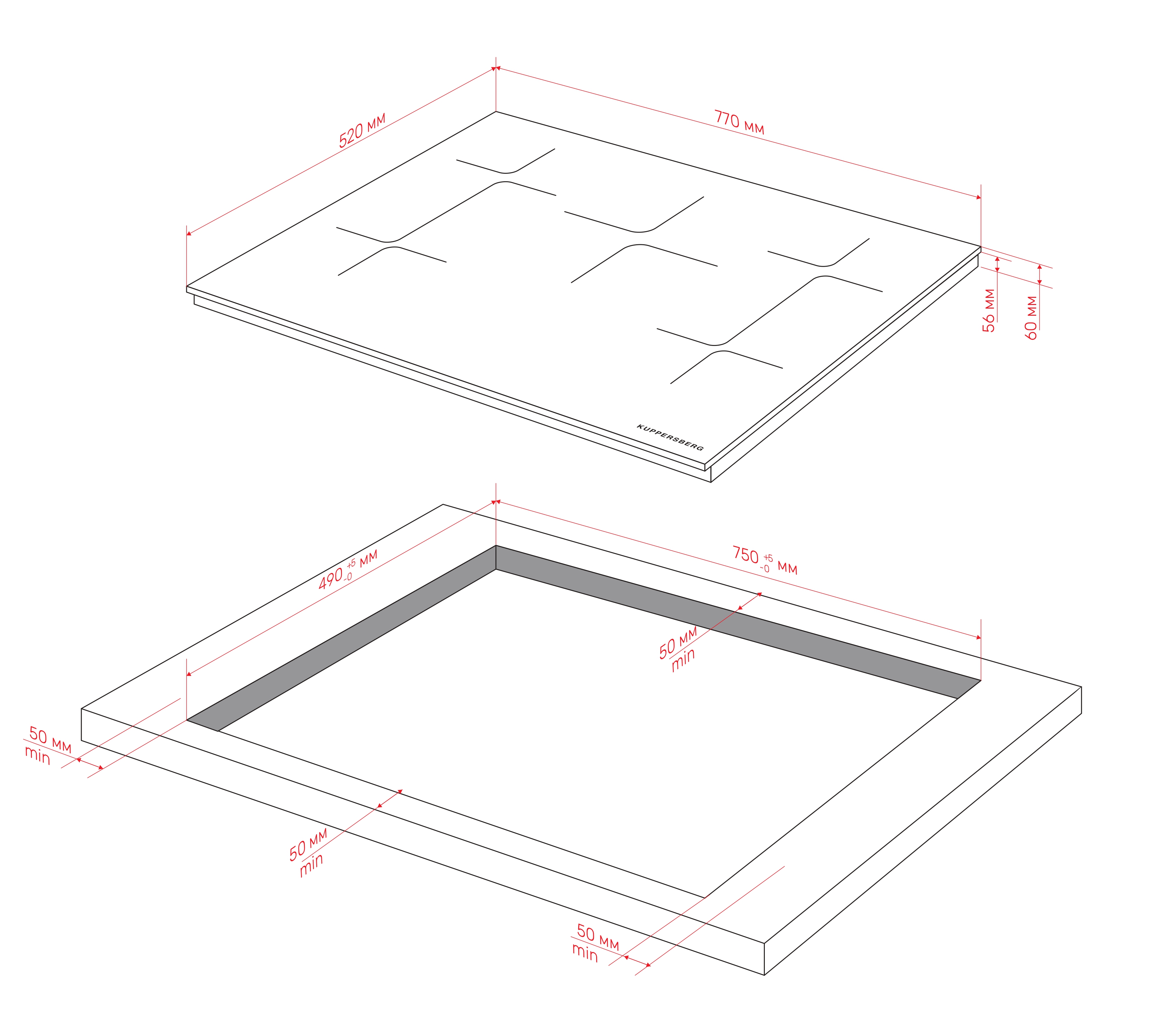 Отверстие в нише выполняют, исходя из размеров самой варочной панели — они должны соответствовать друг другу либо немного превышать размеры выреза. При выборе наиболее распространенной варочной панели с 4 конфорками в столешнице вырезается отверстие шириной 59 см и глубиной около 49-50 см. Толщина столешницы должна быть немного меньше, чем высота варочной панели, в противном случае панель придется заглубить, чтобы она не слишком выступала.