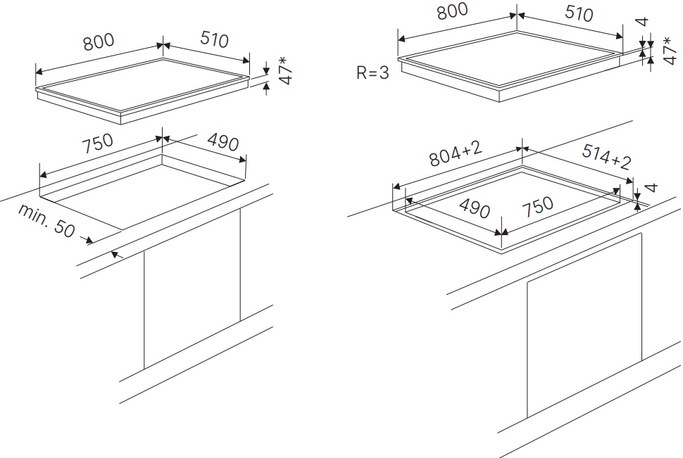 Электрические и индукционные варочные панели из стали, эмали и стеклокерамики имеют толщину от 4 до 5,5 cм, но выглядят более низкими, так как на них отсутствуют выступающие горелки. Как правило, подробные требования к толщине столешницы для установки приводятся в руководстве пользователя.
