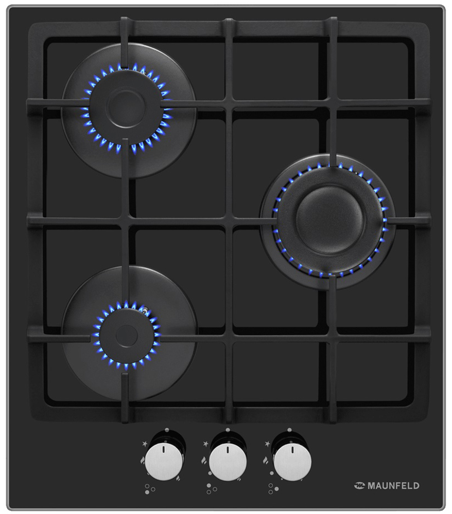 Выбор газовой варочной панели чаще всего обусловлен тем, что в частный дом или квартиру проведен именно газ в качестве обогрева. Работать с этой моделью довольно просто, так как мощность нагрева видна невооруженным взглядом — по силе огня в горелке. Количество конфорок в этой модели: 3.