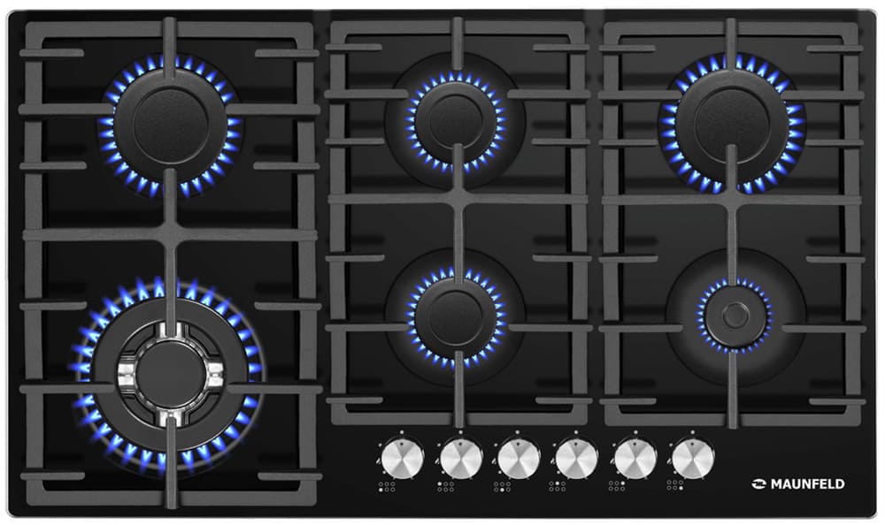 Выбор газовой варочной панели чаще всего обусловлен тем, что в частный дом или квартиру проведен именно газ в качестве обогрева. Работать с этой моделью довольно просто, так как мощность нагрева видна невооруженным взглядом — по силе огня в горелке. Количество конфорок в этой модели: 6.