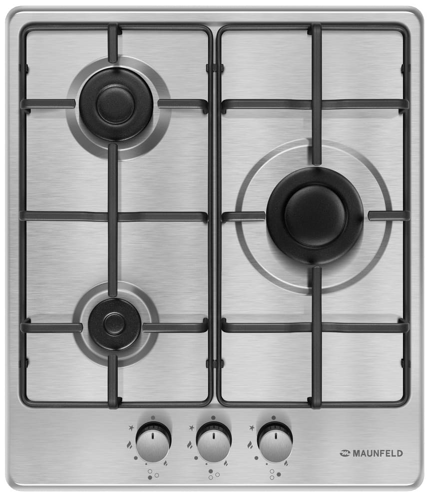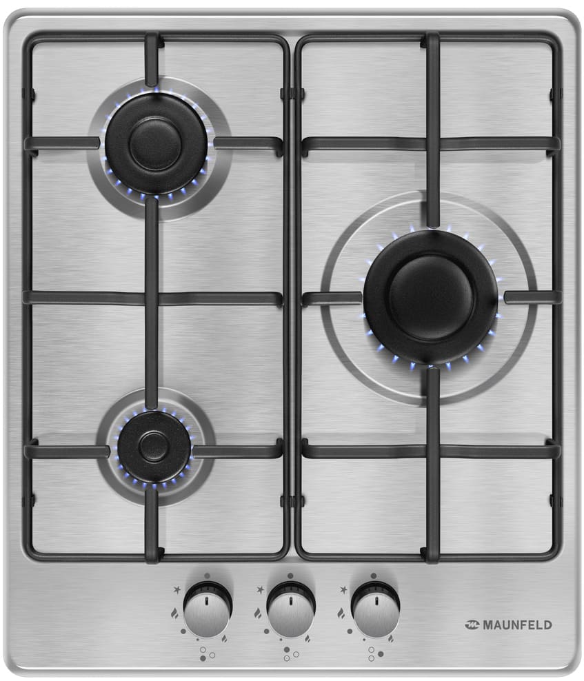 Выбор газовой варочной панели чаще всего обусловлен тем, что в частный дом или квартиру проведен именно газ в качестве обогрева. Работать с этой моделью довольно просто, так как мощность нагрева видна невооруженным взглядом — по силе огня в горелке. Количество конфорок в этой модели: 3.