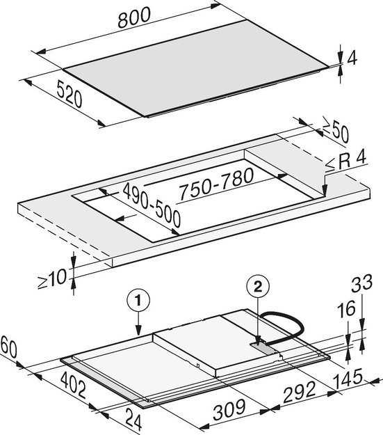 Отверстие в нише выполняют, исходя из размеров самой варочной панели — они должны соответствовать друг другу либо немного превышать размеры выреза. При выборе наиболее распространенной варочной панели с 4 конфорками в столешнице вырезается отверстие шириной 59 см и глубиной около 49-50 см. Толщина столешницы должна быть немного меньше, чем высота варочной панели, в противном случае панель придется заглубить, чтобы она не слишком выступала.