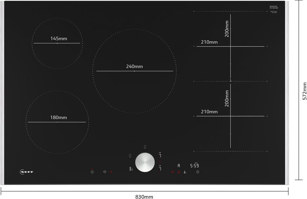 Варочная панель работает на индукционном нагреве — это значит, что повышается температура непосредственно посуды, в которой готовится блюдо. Таким образом промежуточная ступень с предварительным нагревом конфорки пропускается — сокращается время, повышается безопасность. Количество конфорок в этой модели: 5.