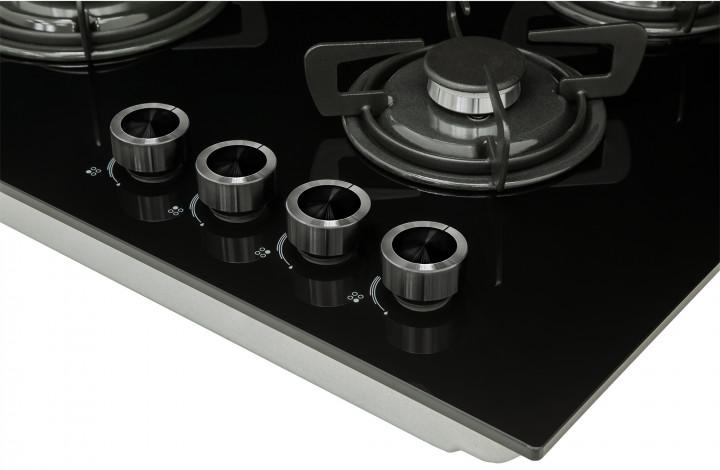 Цвет — черный. Благодаря отсутствию рамки она отлично впишется в интерьер и не займет лишнее место на столешнице, которое можно использовать для работы. Открытый огонь не страшен ни вашей посуде, ни вам, так как горелки надежно закрыты решетками. Материал самой поверхности: закаленное стекло. Управление этой моделью механическое. Для переключения уровней нагрева, выбора функций используются следующие переключатели: поворотные. Простая система контроля за прибором делают его более универсальным, ведь разобраться сможет кто угодно.
