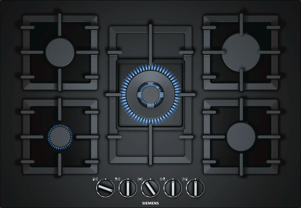 Модель Сименс EP7A6QB90 входит в дизайн-линейку: iQ500. Цвет — черный. Благодаря отсутствию рамки она отлично впишется в интерьер и не займет лишнее место на столешнице, которое можно использовать для работы. Открытый огонь не страшен ни вашей посуде, ни вам, так как горелки надежно закрыты решетками. Материал самой поверхности: закаленное стекло. Управление этой моделью механическое. Для переключения уровней нагрева, выбора функций используются следующие переключатели: поворотные. Простая система контроля за прибором делают его более универсальным, ведь разобраться сможет кто угодно.