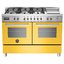 Bertazzoni PRO1206GMFEDGIT из линейки Professional выделяется корпусом желтого глянцевого цвета и увеличенной шириной 120 см. Варочная поверхность изготовлена из нержавеющей стали, на ней находятся шесть газовых конфорок, в том числе конфорка WOK с двумя рядами пламени, а также панель для жарки без посуды Теппан-яки. Конфорки зажигаются с помощью автоподжига, все они имеют систему защиты от утечки газа. Разместить посуду можно на массивных чугунных решетках. На электромеханической стальной панели управления находятся поворотные переключатели и сенсорный дисплей. Две электрические духовки объемом по 69 литров имеют 4 уровня приготовления, они оснащены классическим нагревом, грилем и конвекцией. Под духовками находится вместительный выдвижной ящик для посуды. Стекло в откидных дверцах можно извлечь для очистки.