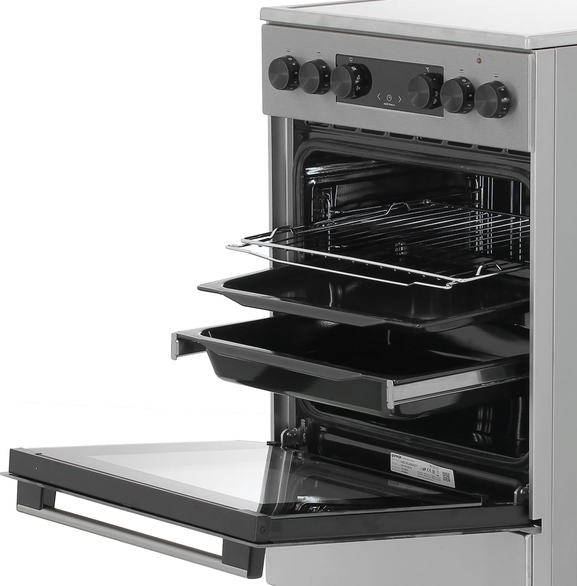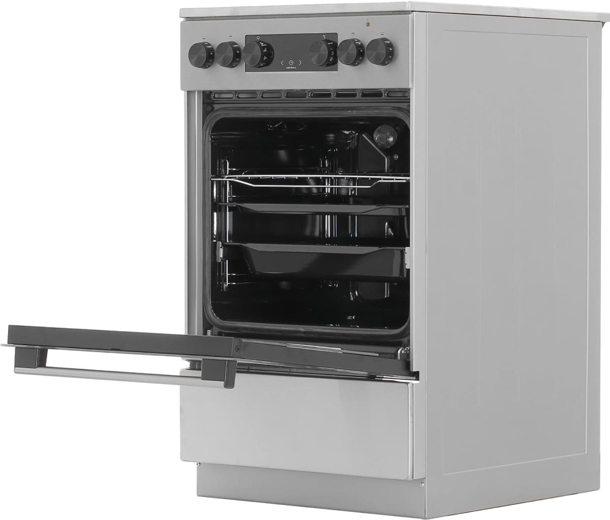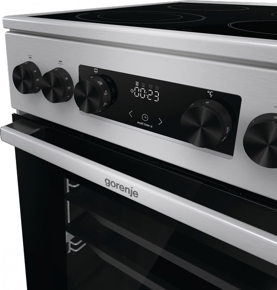 Электрическая плита Gorenje GEC5C40XAOT выполнена в стильном корпусе из нержавеющей стали, который подчеркнёт современный интерьер кухни и устоит против следов от пальцев. Ее компактные габариты 85×50×59.4 см подходят для стандартной ниши, а высота 85 см делает установку удобной для большинства пользователей. Черная фурнитура и стеклокерамическая поверхность создают контраст и облегчают уход, а откидная дверца духовки с тройным стеклом обеспечивает дополнительную теплоизоляцию и безопасность при эксплуатации.
