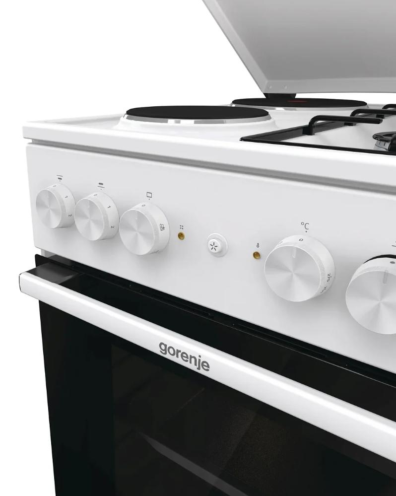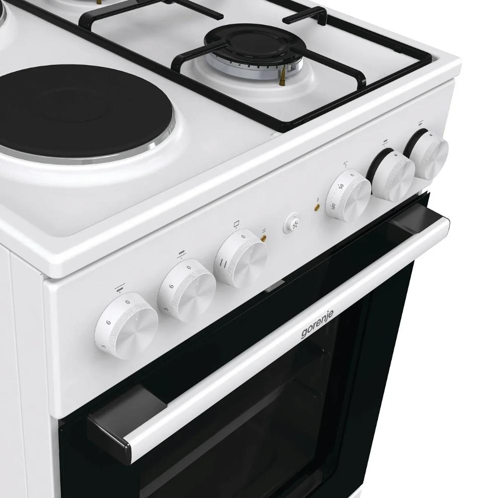 Комбинированная плита Gorenje GK5A12WG — отличный выбор как для квартиры, так и для частного дома. Цвет корпуса белый, он гармонично сочетается с мебелью и техникой похожих оттенков, а также может интересно выглядеть на контрасте с ними. Для управления используется удобная и понятная механическая система. Благодаря ей выбирать режимы приготовления и настраивать параметры температуры очень просто. Переключатели не только выполняют техническую функцию, но и поддерживают общий дизайн; тип элементов: поворотные.