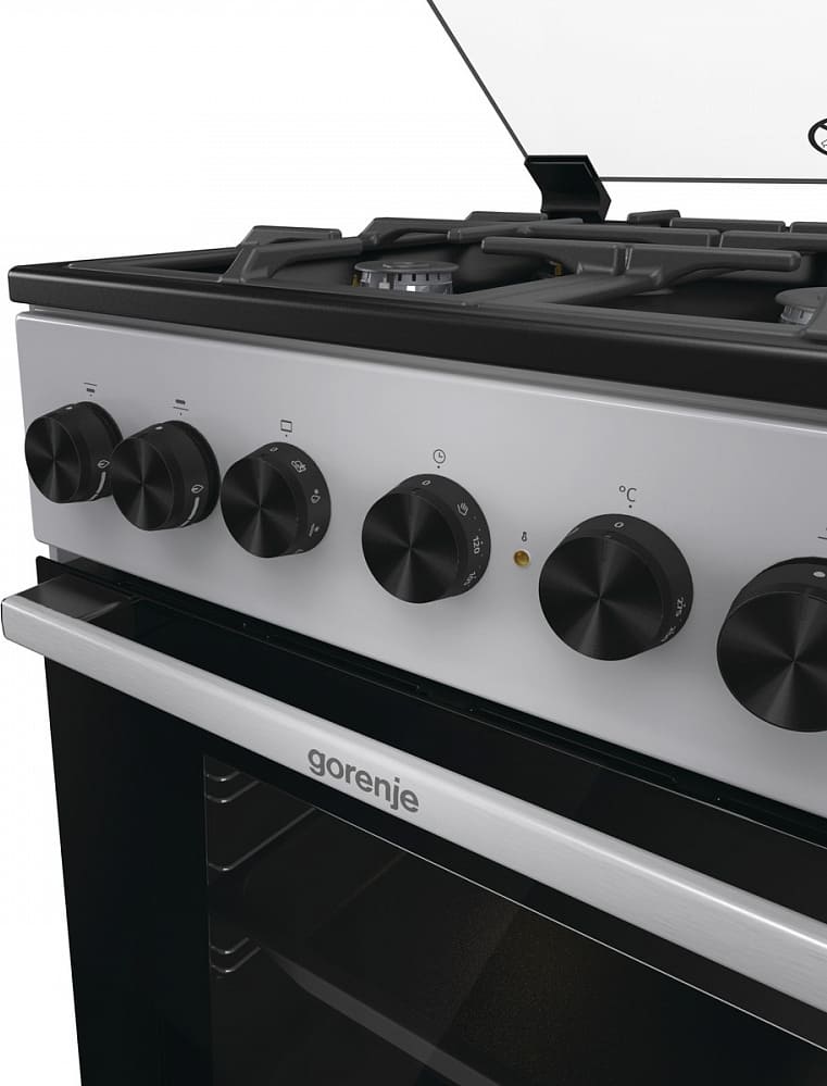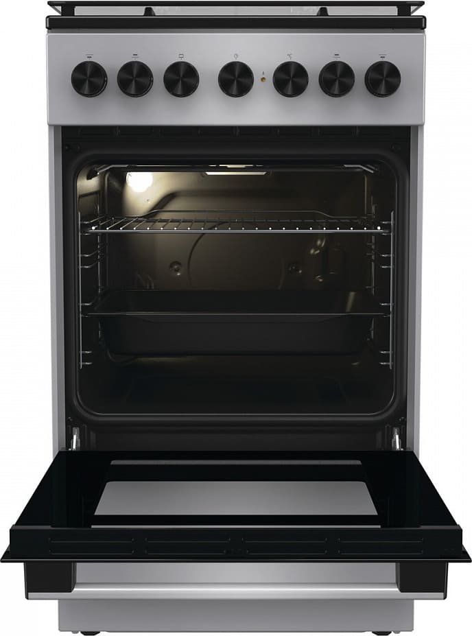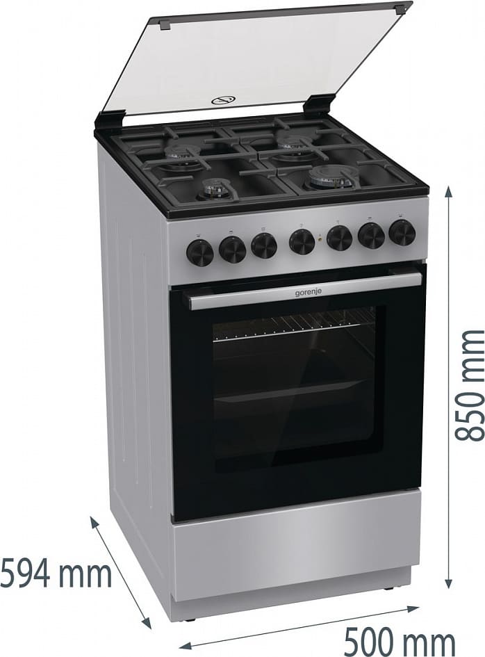 Комбинированная плита Gorenje GK5B44SF объединяет в одном корпусе газовую варочную поверхность и электрическую духовку, предлагая сбалансированное сочетание мощности и точного управления. Корпус серебристого цвета с фурнитурой в тон смотрится современно и аккуратно в любой кухне. Высота 85 см и ширина 50 см делают прибор удобным для стандартных ниш, а глубина 59,4 см обеспечивает компактность без потери функционала.
